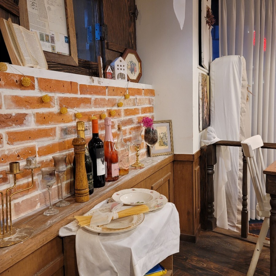 파스타가게 답게 빈티지한 인테리어 소품과 와인 등의 소품을 활용하여 꾸며져 있어요