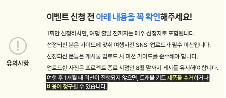 근데 여행사진 SNS 업로드가 되지 않으면 제품을 수거하거나 비용이 청구 될 수 있다는 유의사항이 있었습니다.