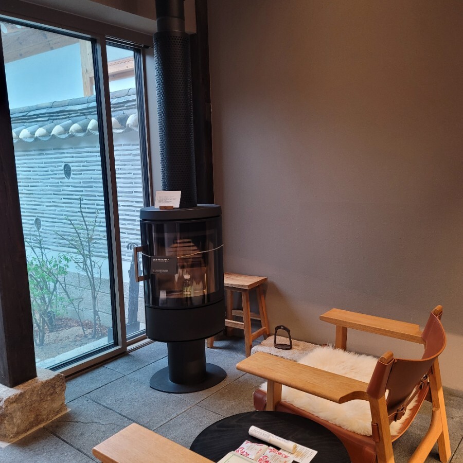 가죽의자 앞에는 에탄올로 불 피우는 난로가 있는데 밤에 불피우면 한옥감성이 두배로 느껴지게 됩니다