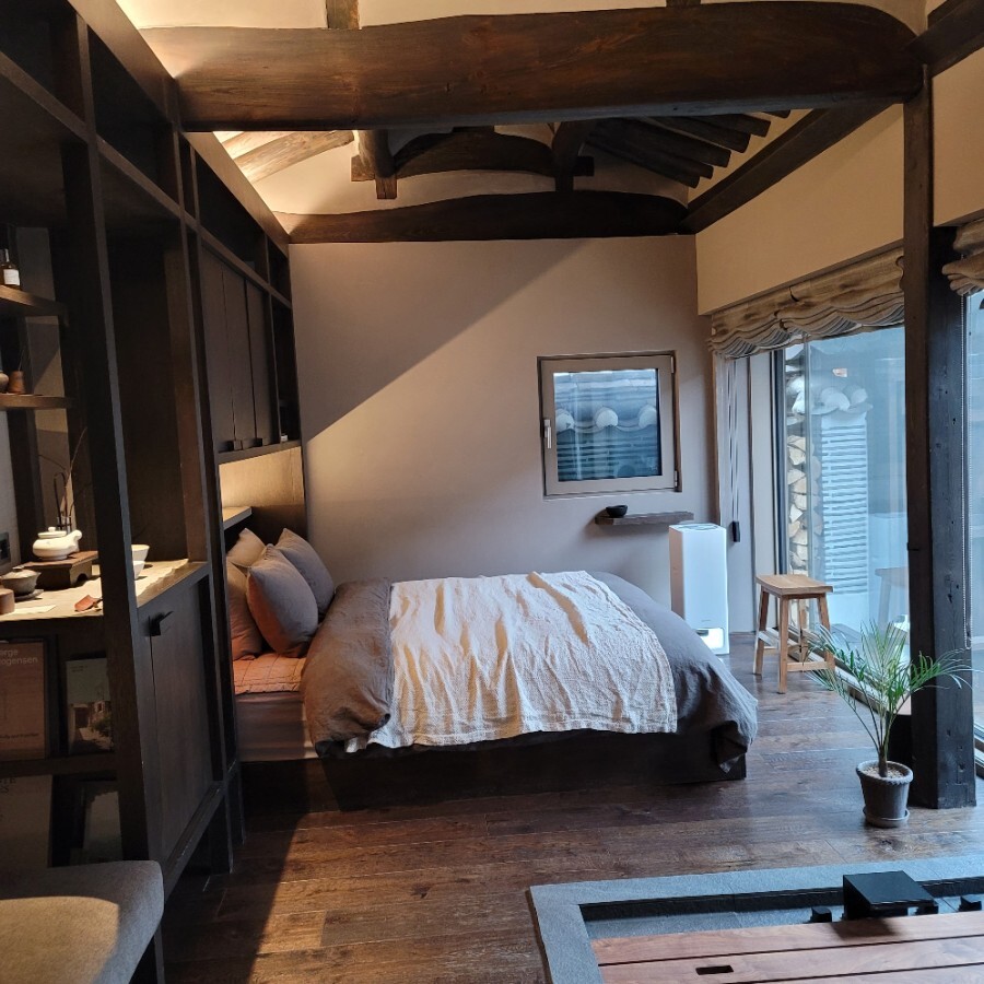 그리고 침대에 누우면 보이는데 적절히 한옥과 현대식이 어우러져 있었지만