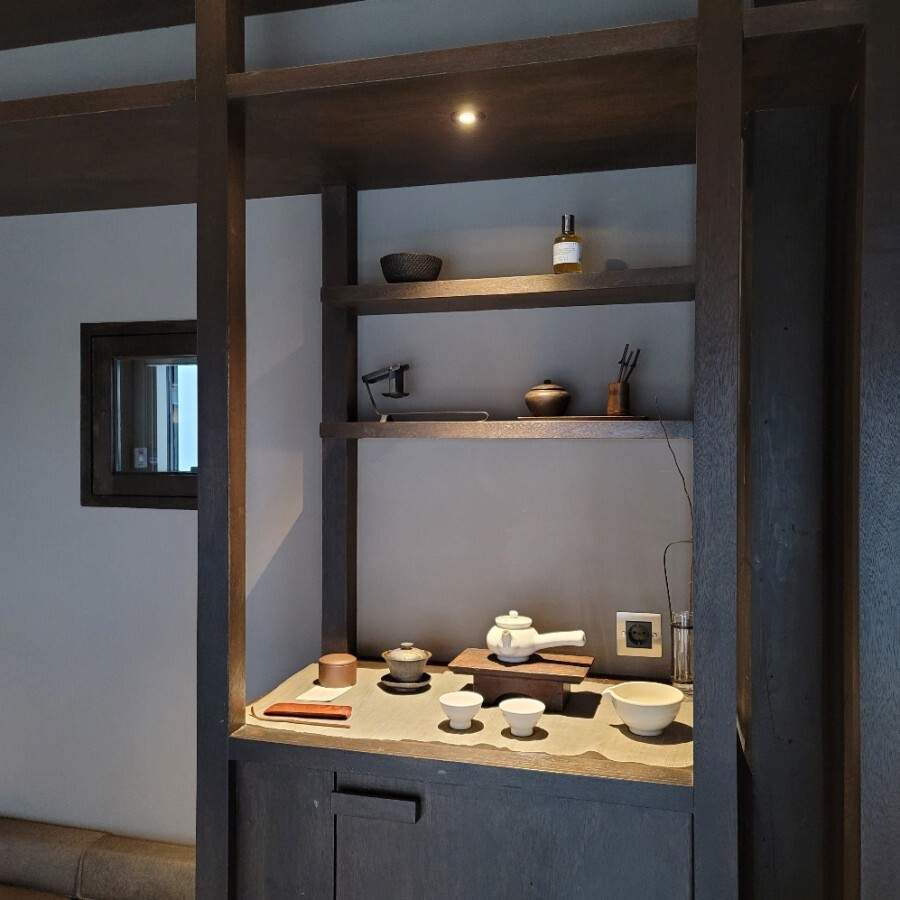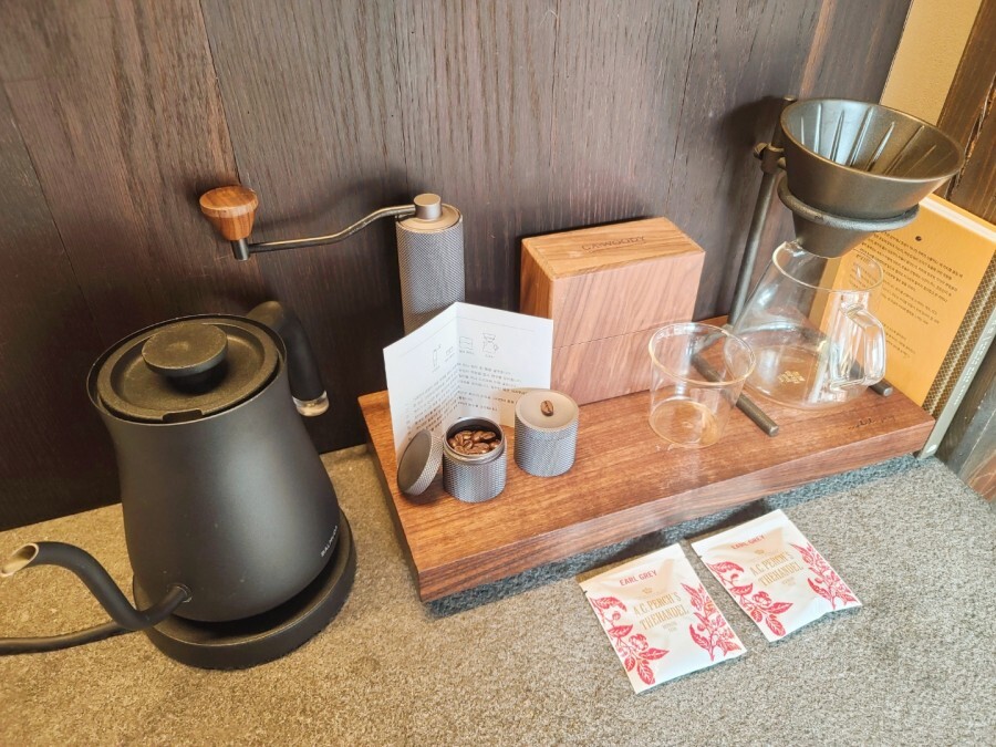그리고 침대 옆에는 한옥과 어울리는 차를 마실 수 있게 준비된 다도세트입니다