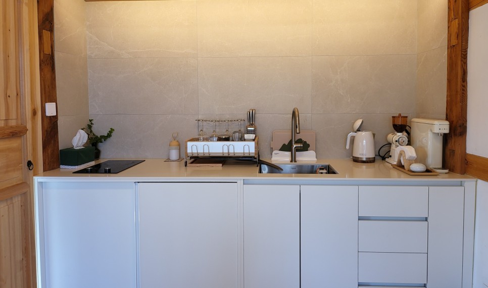 주방에는 인덕션, 와인글라스 4잔, 그라인더, 커피필터, 간단한 녹차티백, 정수기