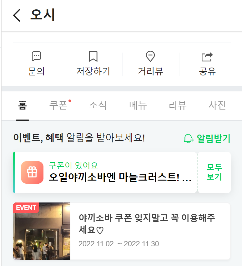 네이버지도에서 오시를 검색하면 쿠폰이 있으니