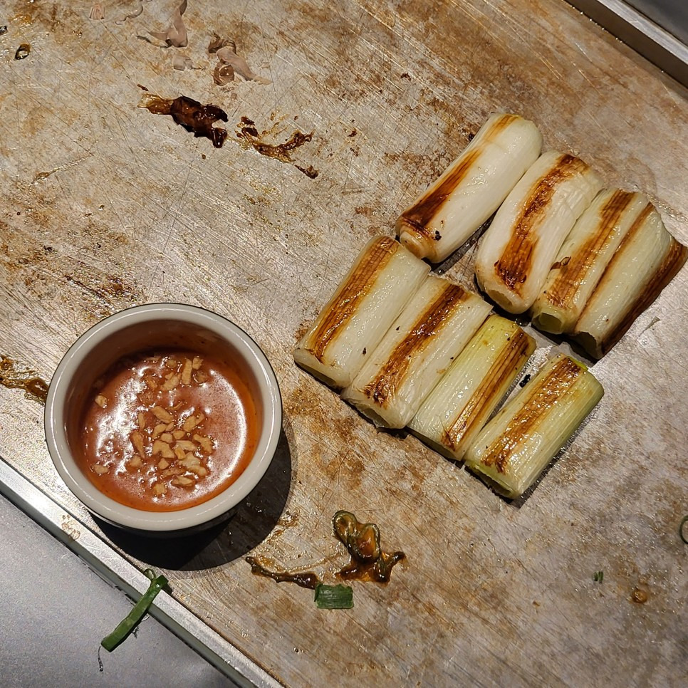 소스를 많이 뿌려 느끼한 맛을 이 대파구이가 싹 잡아주게 된다