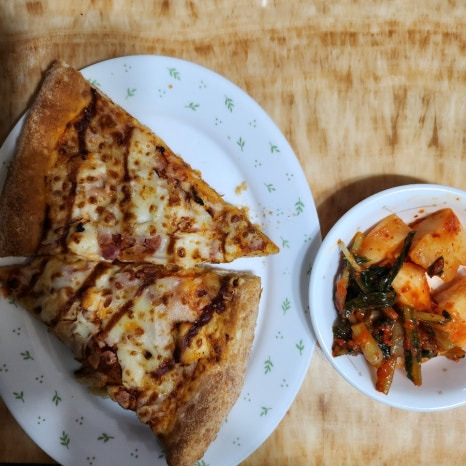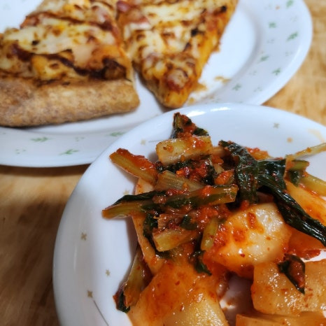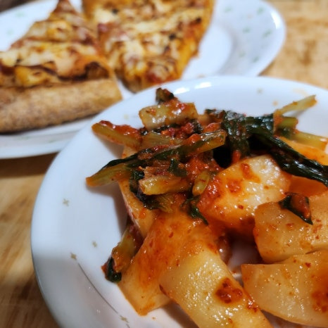 피자에 피클 대신해서 총각무김치랑 먹었어요